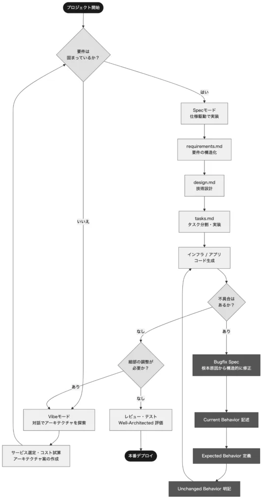 プロジェクト初期のVibeモードで要件とアーキテクチャを固め、Specモードで実装を進め、細かな調整が必要になればVibeモードに戻り、不具合が出たらBugfix Specで根本から修正する――