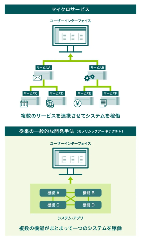 マイクロサービスとは、システムを機能ごとに分けて構築・運用する設計の考え方です。