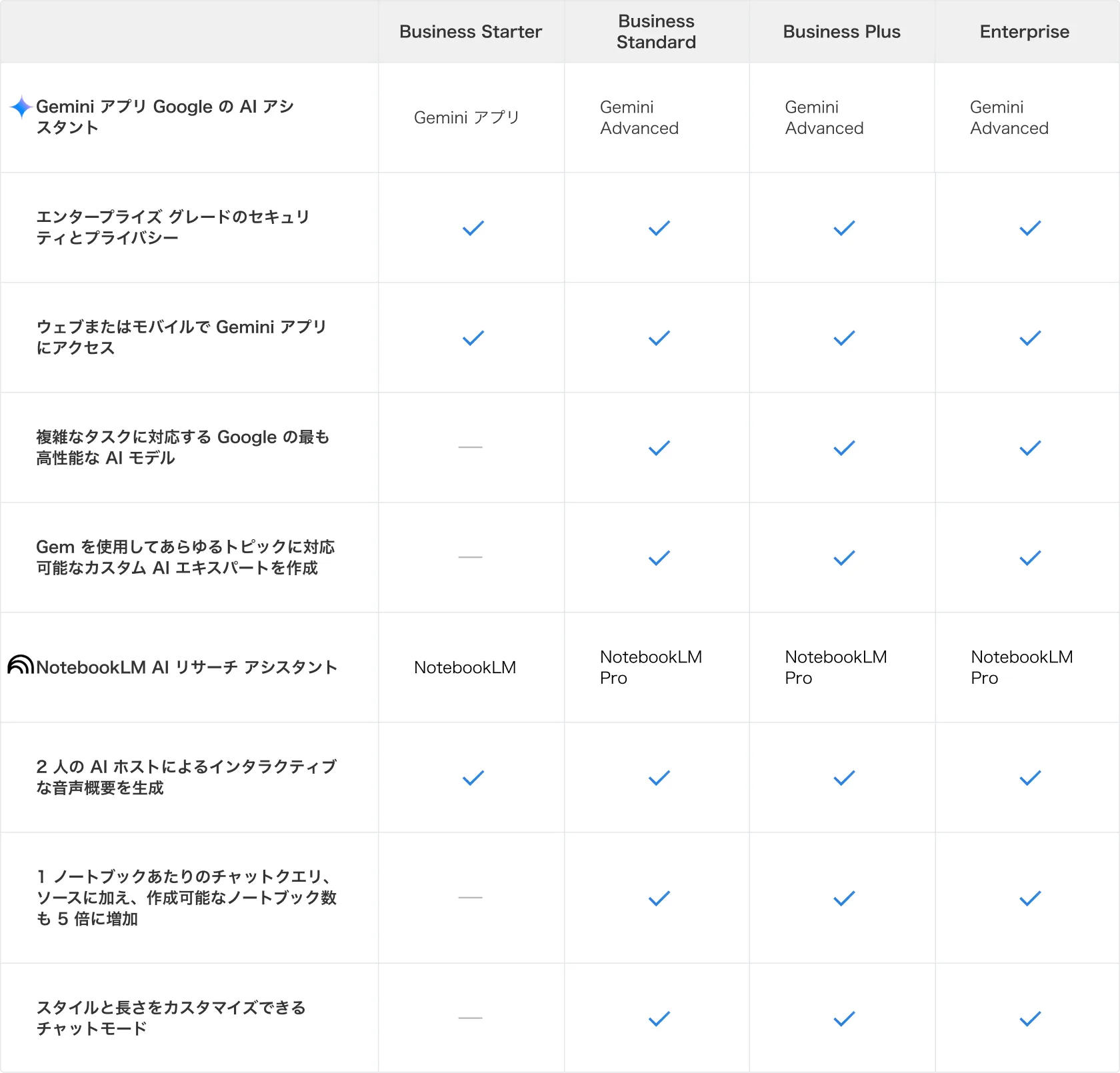 Google Workspace with Gemini の機能を使うためには、以下のWorkspace プランを導入いただくことでAI機能が使えるようになります。