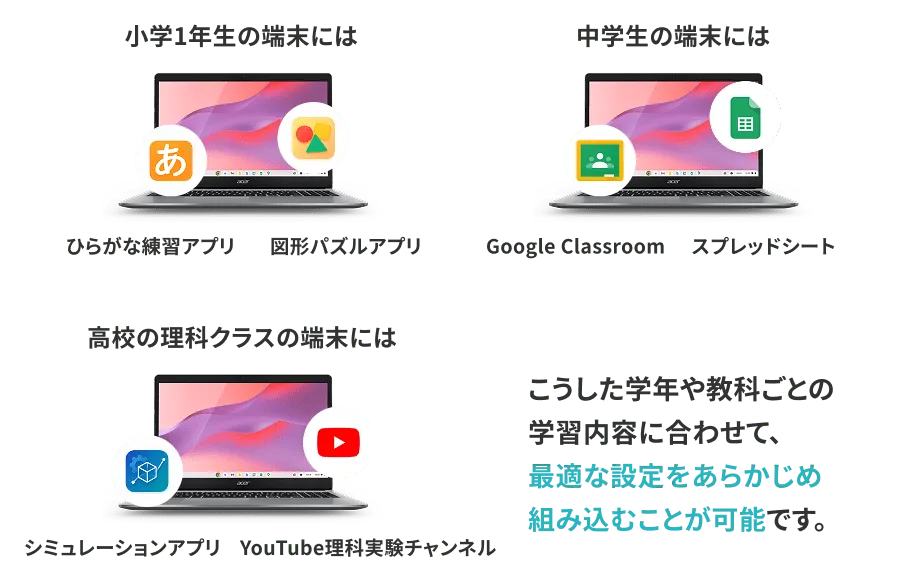 Zero touch では、学年や教科に合わせて、 Chromebook 起動時に表示される画面や使用アプリ・利用制限(例:YouTube™ 制限など)を自動で適用することができます。