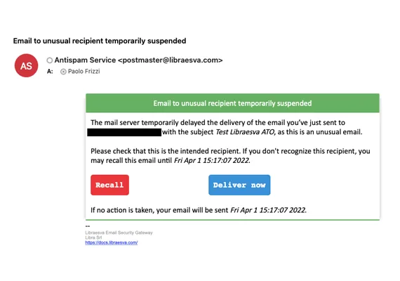 アカウント乗っ取り(ATO)を受けたユーザーがメールを大量送信しようとした際、LibraesvaのATE(適応型信頼エンジン)によって、送信を停止・ユーザーへ通知する機能を持っています。