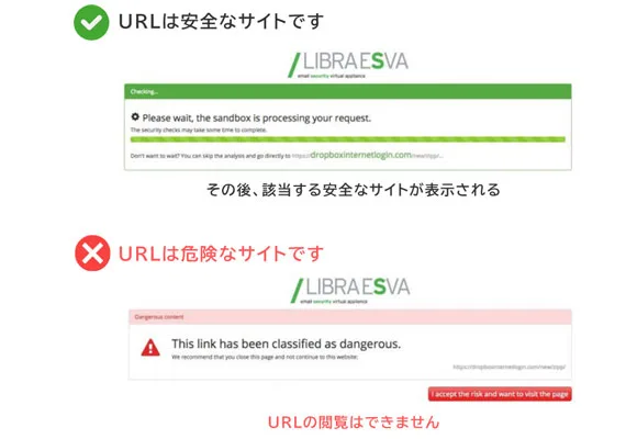 メール本文のURLをLibraesvaが書き換え、Libraesvaの分析サイトを経由させるため、万が一リンクをクリックしても安心