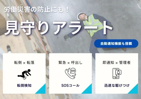 REMONYの見守り機能には、転倒検知機能とSOSコール機能を搭載しています。転倒を即座に検知し、緊急時には自動でSOSコールを発信。これにより労働災害を防ぎ、従業員の安全をしっかりとサポートします。