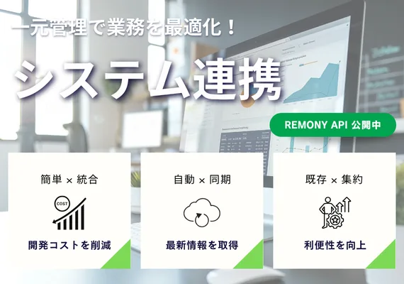 REMONYはAPIを公開しており、既存の業務システムとの連携が可能です。これにより、データの収集・分析が容易になり、一元管理が実現します。管理業務を最適化し、無駄を省いた効率的な運営をサポートします。